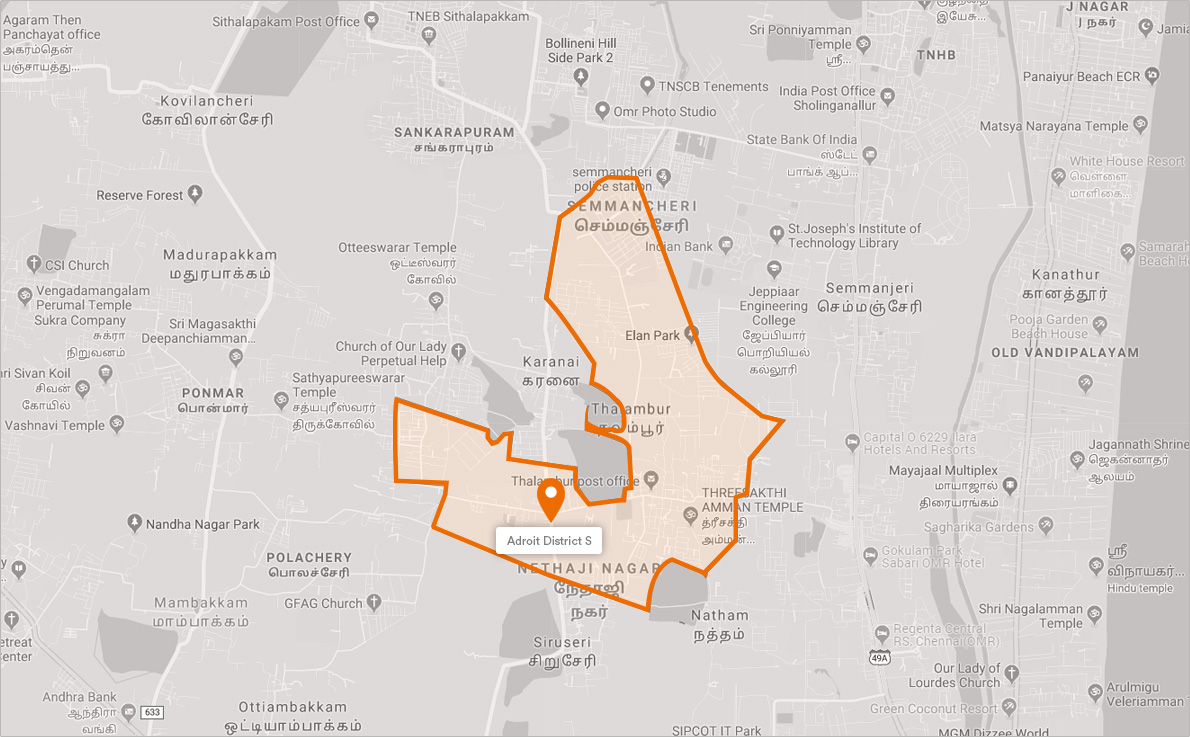 Thalambur's accessibility is enhanced by its excellent road infrastructure and ample public transport. Adroit’s apartments in Thalambur are less than 3 km away from ECR.